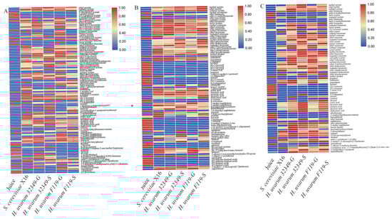 Heatmap of R. roxburghii wine, blueberry wine, and plum wine. (A) R. roxburghii wine; (B) blueberry wine; (C) plum wine.