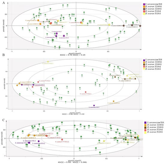 A PCA model was constructed from the volatile aroma compound compositions of three fruit wines produced by different fermentation methods to investigate the similarities and differences in volatile profiles among these fruit wines. The hexagons of each color in the score plot represent the R. roxburghii and blueberry wines produced by different fermentation methods. The green circles in the loadings diagram represent the individual volatiles. The volatile aroma profiles differed significantly between the different fruit juices and the corresponding fruit wines produced by different fermentation methods (Figure 3). In the score plot, a closer distance between the samples indicates a more similar aroma profile, while samples distanced apart from each other have a more distinct aroma profile. In addition, a separation was observed between the fruit juices and the fruit wines produced by different fermentation methods. Most of the fruit wines were distinctly dispersed in the PCA. Among them, H. uvarum 32349-G, F119-G, and S. cerevisiae X16 were clustered together, whereas 32349-S and F119-S formed a distinct cluster. This indicated that 32349-G, F119G, and X16-fermented R. roxburghii wines had high similarity in volatile compound composition, while 32349-S was similar to F119-S. In addition, more volatile aroma compounds were distributed around the fermented fruit wines in the loadings diagram. Therefore, the variety of volatile aroma components in R. roxburghii, blueberry and plum wines produced significantly increased after fermentation. Although the fruit wine aroma compound content decreased in both the co-fermented and sequentially fermented treatments, a difference was observed between them.