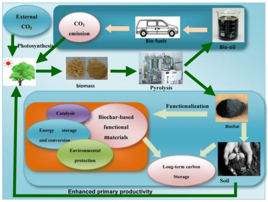 Climate instability and environmental degradation are two of humanity’s most severe global concerns. These are inextricably tied to the growing need for economically feasible and ecologically favorable energy sources that will surely contribute to the creation of a renewable environment. Energy problems, environmental degradation, and global warming are all major issues that concern people all around the world. Consequently, a wide spectrum of people is motivated to discover simple, environmentally friendly, and cost-effective solutions to these challenges. One key part of research is the development of a variety of active materials that may be utilized to address many of the issues connected with both present and future approaches. Materials having catalytic capabilities, for example, can be produced to transform sustainable energies. Biomass may be transformed into biofuels and used as renewable energy [18,19,20]. High-capacity materials can be developed to preserve low-cost, clean, renewable solar, wind, and biomass energy [21]. Adsorbent or catalytic materials that eliminate pollutants or trap CO2 can be produced to solve environmental pollution and global warming challenges. Because of their capability to be used in energy storage, catalysis, adsorption, and gas segregation and collection [22,23,24,25]. Carbon materials are great alternatives for tackling numerous practical challenges. Multiple procedures, such as chemical vapor deposition, arc discharge synthesis, and calcination of synthetic or natural polymers, have been mentioned for synthesizing crystalline carbon nanotubes/nanofibers and graphene, as well as amorphous carbon, activated carbon, and carbon black substances with adjustable characteristics and functionalities. However, these approaches often need time-consuming synthesis procedures, organic solvents, and electrochemical remediation [26,27,28,29]. Biochar is described as a carbon-rich, porous solid formed by biomass pyrolysis at low temperatures (350–700 °C) in a reactor with little or no accessible air. In more scientific aspects, biochar is created by biomass pyrolysis at reduced temperatures with a restricted source of O2. This method frequently resembles the manufacturing of charcoal, one of humanity’s oldest industrial processes. Biochar is classified as a form of biocarbon because of its usage as a chemical source. This is characterized as a diverse spectrum of carbon compounds obtained from a variety of biological components, including plant, animal, and microbial resources. Combustion, pyrolysis, hydrothermal treatment, and gasification are some of the procedures used to create it [30,31,32,33,34]. On the other hand, biochar is produced by the combustion of lignocellulosic plant biomass or its derivatives, implying that biochar has a restricted use than biocarbon. This definition separates biochar from hydrochar, which is produced by the hydrothermal carbonization of biomass or biomass-derived organic substances such as carbohydrates and lignin at generally moderate temperatures (130–250 °C) and considerable pressure (0.3–4.0 MPa) [35]. Biochar has comparatively low porosity and surface area, but it includes rich surface functional groups as well as minerals such as N, P, S, Ca, Mg, and K, according to physical and chemical characterization using a variety of methods. Because of these qualities, biochar can be used as an adsorbent, catalyst, and catalyst support [36,37,38]. More significantly, the large-scale deployment of biochar-based active materials is seen as an ecological approach since waste biomass may be transformed into biochar, which reduces anthropogenic CO2 emissions. Figure 1 summarizes the sustainable theories of biochar production and uses. Biochar derived from biomass pyrolysis may be traced back thousands of years. Slow pyrolysis, quick pyrolysis, flash pyrolysis, and pyrolytic gasification are some of the pyrolysis systems that may be used to make biochar. Pyrolysis for synthesizing biochar from biomass is both cost-effective and ecologically beneficial because considerable amounts of regenerated bioenergy, bio-oil, and gas are generated parallel to the biochar itself [39].
