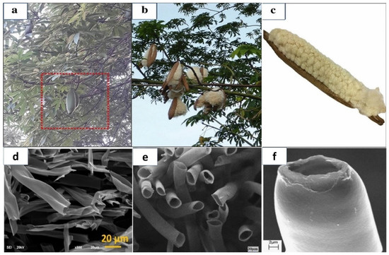 (a) Kapok Fiber tree, (b) A kapok fruit, (c) KF fruit. Reprinted with permission from Ref. [66]. Copyright 2017, copyright Elsevier; SEM scans represent the body (d). Reprinted with permission from Ref. [67]. Copyright 2021, copyright Springer Nature; hollow structure (e) and tail of kapok fiber (f). Reprinted with permission from Ref. [49]. Copyright 2015, copyright Springer Nature.