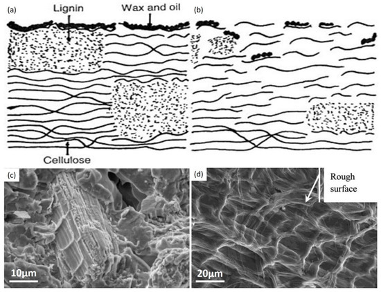 Demonstration of the difference between the pure kapok fiber (a–d) alkalized Kapok Fiber. Reprinted with permission from Ref. [75]. Copyright 2002, copyright John Wiley and Sons.