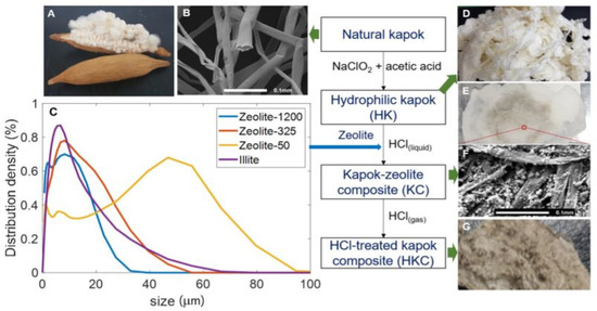 (A) Image. (B) SEM scans of natural kapok fibers. (C) Size dispersion of adsorbent particles as assessed by dynamic light scattering devices. (D) After hydrophilic pretreatment, kapok fiber becomes whiter and firmer. (E) A fine kapok layer surrounds the zeolite fragments, and (F) flattened kapok fibers are heaped without any gaps for the zeolite particles to fall through. (G) HCl-treated kapok fiber turns grey and gets thinner. Reprinted with permission from Ref. [76]. Copyright 2021, copyright Elsevier.