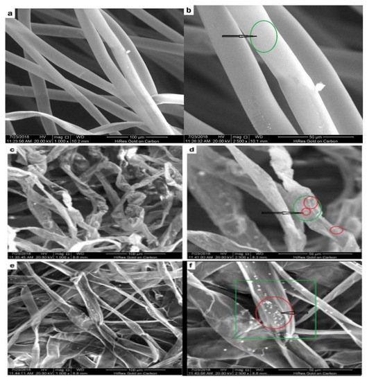 Figure 7 depicts SEM micrographs of raw kapok fibers, treated kapok fibers, and derived cellulose. Pure kapok fiber has a silky look and a smooth surface (Figure 7a,b). The general tubular form remained intact. After alkali processing, the air entrapment within the kapok fiber was removed (Figure 7c–f). The structure was totally flattened, resulting in a flat ribbon-like shape. In addition, the kapok fibers surface was rougher than the untreated fibers. Alkali treatment has been shown to promote crystallinity by removing non-cellulosic particles. The SEM illustration of the produced cellulose after chemical treatment with NaOH and NaClO2 is shown in Figure 7c–f. The diameter variation after treatment with NaOH and NaClO2 was 4.5 to 8.5 m, whereas, it was 18.5 to 23.1 m for samples treated exclusively with NaOH [84].