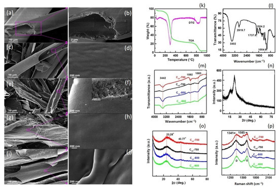 FE-SEM scans of the KF (a,b), CKF-700 (c,d), CKF-750 (e,f), CKF-800 (g,h), and CKF-900 (i,j). TGA and DTG curves of natural KF (k), FT-IR spectra of natural KF (l) and biochars (m), XRD patterns of natural KF (n) and pyrolysis KF (o), and (p) pyrolysis KF Raman spectra. Reprinted with permission from Ref. [90]. Copyright 2018, copyright Elsevier.
