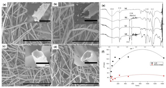 SEM scans of kapok fibers after PAN coating with (a) 10, (b) 15, (c) 20, and (d) 30, CTAB. The PAN-kapok fibers are seen with extreme intensity in the inset. Kapok fibers are 30 mg, PAN is 1.5 mL, and KPS is 60 mg; (e) FTIR bands of (a) pure kapok, (b) PAN-kapok mixtures made with (a) 10, (b) 20, and (d) 40 mg of CTAB. (f) The impact of interaction time on the adsorption performance of PAN-kapok hollow microtubes for Copper (II) and Methyl Orange from an aqueous solution. Reprinted with permission from Ref. [105]. Copyright 2017, copyright Elsevier.