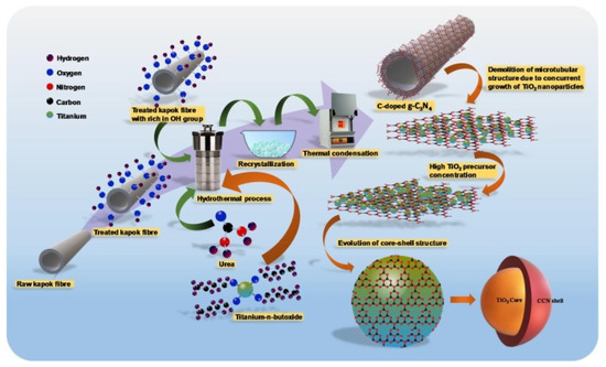 The hydrothermal bio-template procedure was used to generate a C-doped g-C3N4 effectively using the carbonization procedure at 500 °C and nitrogen-coated titanium dioxide as a core-shell heterojunction photocatalyst Figure 12. During constructing a core-shell heterojunction photocatalyst, kapok fiber was exploited as a bio-template and in-situ carbon coated in CN and titanium dioxide. Furthermore, urea application as a g-C3N4 precursor contributes to band-gap narrowing in TiO2 via in-situ C and N loading. Several characterization approaches were used to investigate the impact of TiO2 source amount on the formation of core-shell nanocomposite heterojunction photocatalysts, which can impact and enhance catalytic performance. The photoelectrochemical and photoluminescence investigations revealed that the bio-template core-shell nanocomposite heterojunction photocatalysts had a remarkable improvement in photoinduced electron-hole dissociation performance. The improved photogenerated charge carrier dispersion and shorter band gap lead to enhanced photocatalytic activity, with the CCN/T-1.5 material producing the most hydrogen (625.5 μmol h−1 g−1) in methanol medium [123].