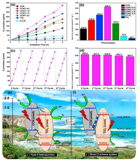 Using photocatalytic H2 generation inside the methanol/water solution during the simulated sun exposure, the visible light photocatalytic performance of the generated materials with varying TiO2 source concentrations was examined. Figure 14a,b demonstrate the photocatalytic hydrogen production during the 6-h exposure period and the hydrogen evolution level for every material. Under specified conditions, all examined samples exhibit visible hydrogen production from the photocatalytic activity. Because it can only be activated by UV exposure, a pure TiO2 with a wide band gap value had the lowest photocatalytic H2 production amount of 36.7 μmol h−1 g−1. However, based on its potential to absorb photons from the visible light area, the photocatalytic hydrogen evolution rate of pure g-C3N4 is 75.8 μmol h−1 g−1. Nevertheless, due to substantial photoinduced electron recombination, its photocatalytic hydrogen evolution rate is significantly lower when compared to other samples. In contrast, the synthesized pure CCN demonstrated a photocatalytic hydrogen evolution rate of 216.8 μmol h−1 g−1, which is approximately a three- and six-fold enhancement above pure g-C3N4 and TiO2, correspondingly. This enhancement was attributable to carbon doping in the CCN, which increased charge carrier separation substantially. The photocatalytic reaction durability of CCN/T-1.5 samples in photocatalytic H2 production was assessed by recycling the sample under comparable reaction circumstances. Following photocatalytic hydrogen evolution, the residual photocatalyst powders were collected. As shown in Figure 14c,d, there is no detectable decrease in the photocatalytic performance of H2 generation of sample CCN/T-1.5 after four cycles and 24 h of processing. Therefore, it was proposed that CCN/T-1.5 displayed excellent consistency for photocatalytic H2 generation. The outstanding consistency is critical for utilizing solar energy in operational applications. Figure 14 depicts the band gap structure of Carbon and Nitrogen co-loaded Titanium dioxide with the visible mid-gap level to demonstrate the influence of Carbon and Nitrogen loading in Titanium dioxide. As shown in Figure 14, the band gap arrangement of Carbon with g-C3N4 and Titanium dioxide crossed the redox performance for water splitting. As a result, the charge segregation mechanism of sample CCN/T-1.5 for photocatalytic hydrogen production can be represented in two ways: type II-heterojunction (Figure 14e) and direct Z-scheme (Figure 14f). In the case of the type-II heterojunction process (Figure 14e), electron excitation from VB to CB occurs in both Carbon with g-C3N4 and Titanium dioxide during photon energy absorption. Since the CB energy band of CCN is more negative than the CB energy band of TiO2, photogenerated electron transport from Carbon with g-C3N4 to Titanium dioxide occurs via the developed core-shell heterojunction framework. With the presence of Pt nanoparticles as cocatalysts, the deposited high-density photogenerated electrons at TiO2 CB concurrently interact with proton or water to produce H2. As a result, the photo-induced charge carriers are efficiently separated in space. Meanwhile, since TiO2 has a higher VB band energy level than CCN, the photogenerated h+ from Titanium dioxide moves to the CCN valence band. At this point, the sacrificial agent is methanol, which consumes the high-density collected photogenerated positive hole. This process may also inhibit positive hole and photogenerated electron recombination at CB of CCN [123].