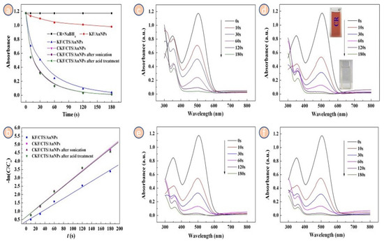 The catalytic function, as depicted in Figure 15a, did not generate any significant variation in the absorbance of the aqueous solution and no H2 was formed in the total lack of the catalyst, demonstrating that BH−4 ions could not lower the CR color. The absorbance was moderately reduced after the addition of KF or KF/AuNPs to the solution, but there was no discernible decolorization of the CR color. This demonstrates that KF or KF/AuNPs have no further catalytic effect in decreasing CR color and that the only effect is decreased adsorption of KF or KF/AuNPs for CR dye. Once the KF/CTS/AuNPs and CKF/CTS/AuNPs nano-structure were applied to the CR solution, including BH−4 ions, the absorbance immediately dropped to near zero, and the color of the solution practically lost color during three minutes (Figure 15a). The appropriate curves of ln(C/C0) versus t are shown in Figure 15b, and the value constant Kobs (first-order rate constant) may be derived. The catalytic degradation activity constants for KF/CTS/AuNPs are 0.0171 s−1, 0.0229 s−1 for CKF/CTS/AuNPs, 0.0223 s−1 for CKF/CTS/AuNPs following ultrasonic treatment, and 0.0225 s−1 for CKF/CTS/AuNPs after acid treatment. The elimination level of CR solution catalyzed by CKF/CTS/AuNPs is higher than that of KF/CTS/AuNPs, showing that increasing the quantity of Au0 charged in the nanocomposite is beneficial to improve the catalytic activity (Figure 15c,d). Furthermore, after 20 min of ultrasonication and 1 mol/L HCl solution treatment, the nanocomposite retains significant catalytic interaction (Figure 15e,f), and the catalytic removal yield values of CKF/CTS/AuNPs are marginally reduced from 0.0229 s−1 to 0.0223 s−1 (after sonication) and 0.0225 s−1. This also shows that the nano-structure has acceptable consistency and high performance.