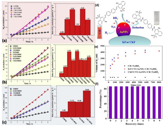 (a–c) Photocatalytic hydrogen production of g-C3N4 and kapok altered g-C3N4 composite created at various temperatures under visible-light exposure in 6 h and the associated Hydrogen production level. Reprinted with permission from Ref. [125]. Copyright 2019, copyright Elsevier; (d) process for catalytic removal of CR dye by NaBH4 employing KF/CTS/AuNPs or CKF/CTS/AuNPs as catalysts are presented. (e) The proportion of hydrogen generated varies over time; (f) After 10 cycles, the catalytic productivity of the CKF/CTS/AuNPs nanocomposite. Reprinted with permission from Ref. [128]. Copyright 2014, copyright Elsevier.