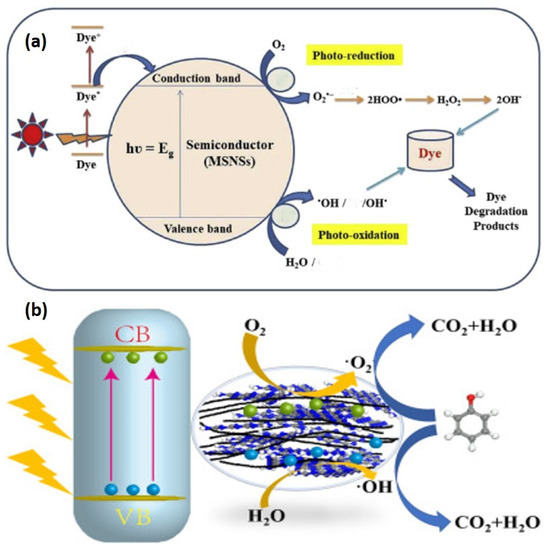 Photocatalytic processes can occur either homogeneously or heterogeneously. Still, recently, heterogeneous photocatalysis has received significantly more attention due to its significant value in a range of environmental and power-related purposes and molecular compound production. The photocatalytic reaction in heterogeneous photocatalysis presupposes the establishment of an interaction between a solid photocatalyst and another material holding the reagents and products of the process. As a result, the term “heterogeneous photocatalysis” is mostly applied when a light-absorbing photocatalyst is within the interaction with both a solvent and a vapor state. It has drawn continuous investigation since its inception, as seen by the large volume of decent papers, reviews, and books dedicated by different scholars to diverse heterogeneous photocatalysis processes [141]. Heterogeneous photocatalysis has proven to be an effective method for decomposing organic pollutants in the atmosphere and water, including colors, insecticides, and hazardous chemical compounds. It employs UV light in the existence of a semiconductor photocatalyst to speed up the removal of eco-system pollutants and the degradation of highly dangerous compounds [142]. However, photocatalytic degradation events take place in both homogeneous and heterogeneous environments. Solid semiconductors are generally more widely utilized because they are less expensive, more resilient, and easier to recycle and utilize than liquid photocatalysts. Considering the potential of heterogeneous photocatalysis, in contrast, homogeneous systems should not be neglected, and they may occupy a more significant function in the long term [143]. Photocatalysis can also occur in the homogeneous process by employing particles as photocatalysts because molecule-simulated steps are more significant reductants than the initial state, resulting in an electron distribution procedure. On the other hand, the composition of excited states may facilitate atom migration. As a result, colors exhibit intense bands in the UV range and the observable spectrum in homogeneous photocatalysis. Figure 17 depicts the hypothesized mechanism of photocatalytic degradation of organic dyes utilizing semiconductor MSNSs under varied light irradiations. In summary, as a dual-function modifier, KF offered a carbon supply for carbon loading and converted it into an activated carbon platform after carbonization, allowing g-C3N4 to develop on it. In addition, due to the decrease in bang gap intensity, extra electron-hole pairs are generated while the KF-altered catalyst is activated by visible light. Because of the high contact between the functional carbon substrate and g-C3N4, charges can travel quickly between them, resulting in a lower electron-hole recombination yield. As seen in Figure 17, the photoelectrons and holes are transformed into powerful oxidizing species, which oxidize the phenol to carbon dioxide and water [144].