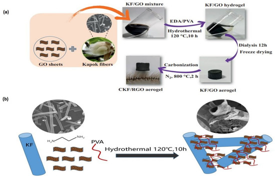 Via hydrothermal bonding with EDA and PVA, an elastic KF/GO hydrogel was created from NaClO2-pretreated short kapok fibers and GO sheets. After freeze-drying, the KF/GO hydrogel, a black cylinder aerogel, was formed. The as-prepared aerogel has high mechanical stability, with a standing loading of 200 g. In the calcination procedure, GO can be decreased by adding kapok fibers comprising cellulose at high temperatures, as detailed below. The free-standing CKF/RGO aerogel is mechanically strong and has a low volume (8.5 mg cm–3). Dog-tail grass could be used to maintain the lightweight CKF/RGO aerogel (Figure 18a). A slight decline in EDA could result in the GO sheet’s self-assembling. The KF and GO were then cross-linked into the hydrogel with minor quantity contraction due to hydrogen bonds and physical interaction between cellulose molecules and GO and the bonding impacts of PVA and GO’s large specific surface area (Figure 18b) [145].