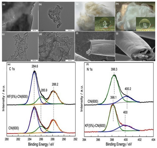 The electrical status of surface components was investigated using XPS wavelengths. The XPS bands of CN (600) and KF (5%)-CN (600) in the area of C 1s are shown in Figure 19e,f. For CN, three peaks are found at 284.6 eV, 285.9 eV, and 288.2 eV. (600). They are related to the contaminating carbon feedstock, the final C-NHx shape, and the aromatic ring’s N=C–N structure in that order. Organic emptiness kapok fibers with minimal value were used as a substrate to manufacture extremely effective polyaniline (PANI)-based adsorbents for heavy metal and chemical color contaminants. The PANI with kapok nano-structure was created through the polymerization of aniline monomer in an acidic environment with ammonium persulfate (APS) as the oxidizing component. The deposition, structure, hydrophilic behavior, and immobilization ability of the kapok fiber with PANI nano-structure were customized by executing NaClO2 processing and adjusting the APS to the aniline amount. The processing with NaClO2 was discovered to improve aniline monomer adherence on the membrane of KF, resulting in a high-performance coating. To eliminate the lignin component from the kapok fibers, NaClO2 was utilized as a preparatory step (KpF). In an acidic environment, NaClO2 creates chlorine dioxide, which causes lignin to oxidize and be removed [79,146]. The degradation rate improves the crystalline portion of the cellulosic substrate, promoting aniline infiltration and adherence [147]. The weight of KpF was lowered from 1.5 to 1.3 g following the NaClO2 recovery. This 13.3% diminution falls within the observed variation of lignin in KF (13–21.5%) [148]. Furthermore, the reported color shift from yellowish to white, as illustrated in Figure 19a,b, suggests that the substance is primarily composed of cellulosic components [149]. The hydrophobicity of NaClO2-KpF decreased as the constant water interaction position decreased from 155 to 140°.