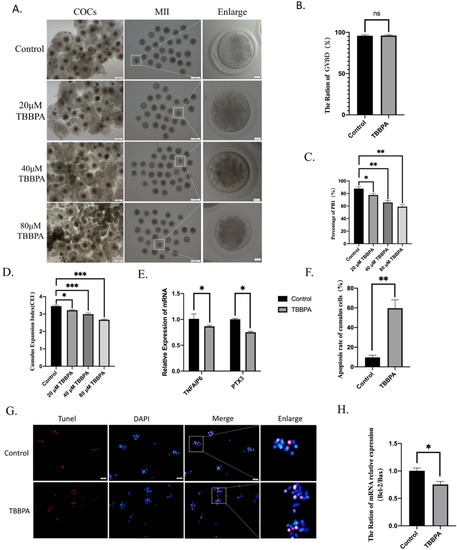 For this purpose, oocyte maturation indicators and related signaling pathways were examined after COCs were treated with TBBPA. Our results showed that TBBPA treatment impaired oocyte meiotic progression and the expansion of cumulus cells. Meanwhile, cumulus-cell apoptosis was also induced after TBBPA exposure. The bidirectional communication between the oocyte and cumulus was crucial to producing a healthy oocyte. Cumulus-cell expansion is necessary for oocyte maturation and subsequent embryonic development. Cumulus cells supply substrates for energy metabolism and biosynthesis to the oocyte [28,29]. Previous studies have also showed that cumulus-cell apoptosis is regarded as a marker for oocyte competence [30]. Therefore, TBBPA displays reproductive toxicity not only to oocyte maturation but also to cumulus cells, which in turn regulate oocyte maturation.