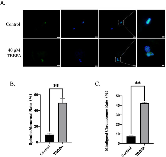 Effects of TBBPA on spindle/chromosome organization in oocytes: (A) Representative images of chromosome alignment and spindle morphology after TBBPA treatment. Ex/Em, 488/530 nm; Ex/Em, 371/464 nm. Scale bar = 20 μm. Enlarge: scale bar = 10 μm. (B) Spindle abnormal rate in each group. Control, n = 50; TBBPA, n = 45. (C) The percentage of misaligned chromosomes was quantified. Control, n = 50; TBBPA, n = 45. ** p < 0.01.