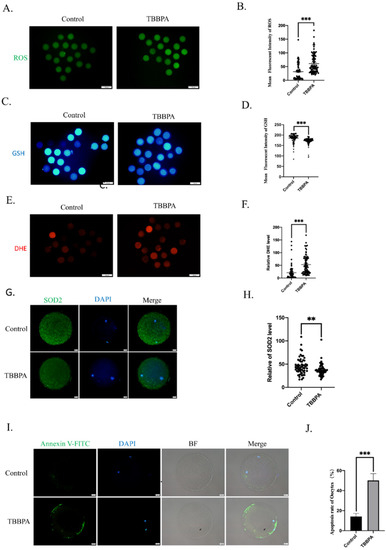 Effects of TBBPA on oxidative stress and apoptosis in oocytes: (A) Generation of ROS after TBBPA treatment. Ex/Em, 488/530 nm. Scale bar = 100 μm. (B) ROS levels were reflected by the mean fluorescent intensity of ROS. Control, n = 79; TBBPA, n = 81. (C) Representative images of GSH after TBBPA treatment. Ex/Em, 371/464 nm. Scale bar = 100 μm. (D) Mean fluorescent intensity of GSH. Control, n = 108; TBBPA, n = 114. (E) Representative images of DHE after TBBPA treatment. Ex/Em, 529/590. Scale bar = 100 μm. (F) Mean fluorescent intensity of DHE. Control, n = 74; TBBPA, n = 83. (G) Protein expression level of SOD2 after TBBPA treatment. Ex/Em, 488/530 nm. Scale bar = 100 μm. (H) Mean fluorescent intensity of SOD2. Control, n = 58; TBBPA, n = 56. (I) Annexin-V levels after TBBPA treatment. Ex/Em, 488/530 nm. Scale bar = 20 μm. (J) Apoptosis rate in each group. ** p < 0.01, *** p < 0.001.