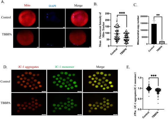 Mitochondria are the main organelles for ROS generation and are regarded to be among the most important markers of cytoplasmic maturation of oocytes. Therefore, mitochondrial function was examined. The mitochondria content of oocytes was first detected. The fluorescence results displayed that TBBPA exposure led to mitochondria signal reduction (Figure 4A). The quantitative analysis also demonstrated that the fluorescence intensity of mitochondria decreased dramatically (Figure 4B). Furthermore, the mtDNA copy number also decreased significantly (Figure 4C). The mitochondrial membrane potential (ΔΨm) is an essential indicator of mitochondrial function. ΔΨm is a prerequisite for mitochondrial oxidative phosphorylation and the production of ATP. At the same time, it is conducive to maintaining the normal physiological functions of cells [24]. Oocytes from different groups were collected to evaluate mitochondrial function. ΔΨm was detected using JC-1 staining in control and TBBPA groups. As shown in Figure 4D, JC-1 monomers displayed an obvious green signal, and JC-1 aggregates were the opposite. ΔΨm revealed a sharp decline after TBBPA treatment (Figure 4E). Altogether, these results suggested that TBBPA exposure impaired mitochondrial function.
