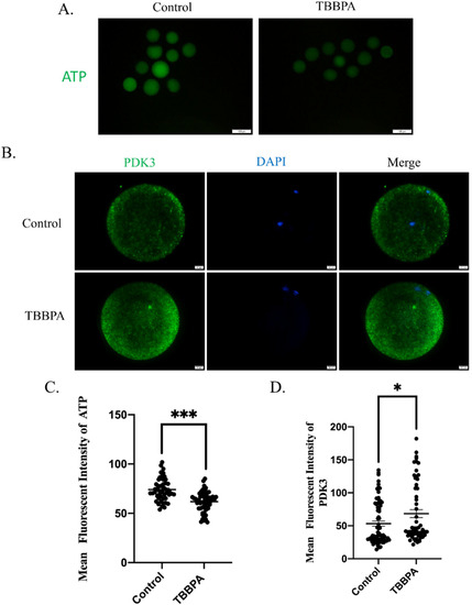 Mitochondria are the primary sites for ATP production, which is necessary to produce energy for cellular biological events. The ATP content was also examined after TBBPA treatment. As presented in Figure 5A, the ATP signal was much weaker in the TBBPA group than that in the control group. The fluorescence intensity was decreased significantly in TBBPA-treated oocytes (Figure 5C). Pyruvate dehydrogenase kinase (PDK) is a key factor to participate in pyruvate metabolism. We speculated that TBBPA disrupted ATP supplements by regulating the PDK pathway. To confirm this, PDK3 was determined after TBBPA exposure. We found that PDK3 fluorescence intensity increased significantly (Figure 5B,D). These results indicated that TBBPA impaired oocyte maturation because of PDK3-induced ATP deficiency.