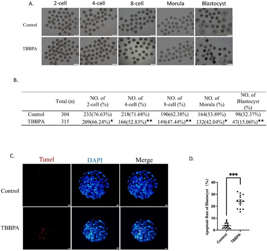 Effects of TBBPA on the developmental competence of oocytes: (A) Development of embryos in different stages after TBBPA treatment. Scale bar = 100 μm. (B) Developmental percentage of embryos in different stages. (C) Representative images of TUNEL staining of blastocysts in control and TBBPA groups. Ex/Em, 529/590; Ex/Em, 371/464 nm. Scale bar = 10 μm. (D) Apoptotic rate of blastocysts in each group. * p < 0.05, ** p < 0.01, and *** p < 0.001.