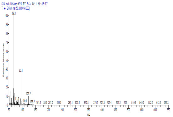 Table 8 and Figure 2 demonstrated the volatile components of a methanolic extract of Solenostemma argel using GC-MS. Data in Table 8 and Figure 2 indicated that nineteen bioactive substances were identified and categorized based on their chemical structures using GC-MS analysis. cis-2,6-dimethyl-2,6-octadiene (8.95%), 2,6-octadiene, 2,6 dimethyl (4.19%), cyclohexene, 1-methyl-4-(1 methylethenyl)-,(S) (2.70%), 1,3-dioxolane,4-methyl-2-pentadecyl (9.69%), bicyclo [3.1.0] hexane, 4-methylene-1-(1-methylethyl) (1.64%), N,N′-bis (3-Aminopropyl) ethylenediamine (3.33%), 2-furanmethanol, 5-ethenyltetrahydro-À,À,5-trimethyl-, cis (5.01%) 2-furanmethanol,5-ethenyltetrahydro-À,À,5-trimethyl-, cis (4.41%), linalool (2.87%) nonanoic acid, 9-oxo-, methyl ester (3.33%), methyl 3-methylbutanoate (7.34%), hexanoic acid, methyl ester (10.93%), cis-3-hexenyllactate (2.97%), phenol, 2-(1,1-dimethylethyl) (8.50%), 2-(5-methyl-5 vinyltetrah ydro-2-furanyl)-2-propanol (11.63%), 1,3,5-triazine-2,4-diamine,6-chloro-n-ethyl (3.12%), hexadecanoic acid, methyl ester (4.80%), 9,12-octadecadienoic acid (z,z)-, methyl ester (1.85%), 10-octadecenoic acid, methyl ester (2.76%), and 2-(5-methyl-5 vinyl tetrahydro-2-furanyl)-2-propanol (11.63%) were the main volatile components.