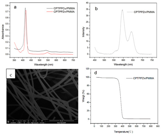 UV-Vis absorption spectrum (a), fluorescence emission spectrum (b), scanning electron microscope (c), and thermogravimetric curve (d) of metalloporphyrin/PMMA electrospun fiber.