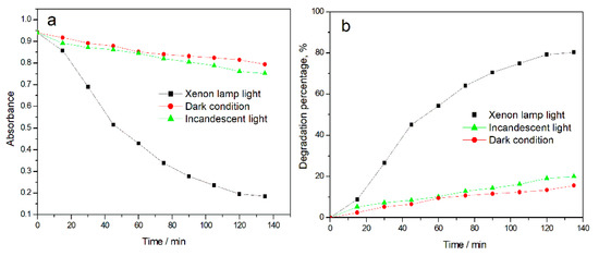 Under the same conditions, the catalytic degradation activity of metalloporphyrin/PMMA electrospun fibers under different light sources was studied. Here, 100 mL of MB solution and 230 mg of CPTPPCu/PMMA electrospun fiber (equivalent to 1 mg of CPTPPCu) were added to three reactors. After adsorption equilibrium, the three reactors were placed in darkness, incandescent lamp, and xenon lamp conditions for degradation experiments, respectively. The experimental results are shown in Figure 3. Under the xenon lamp condition, CPTPPCu/PMMA electrospun fiber had the best degradation effect on MB solution, and the effect was the most obvious in the first hour, with the degradation percentage reaching 54.29%. After 135 min, the degradation percentages of MB under the xenon lamp, incandescent lamp, and dark conditions were 80.35%, 20.03%, and 15.57%, respectively. Since the xenon lamp light source has a spectrum similar to sunlight, it is a high light power and wide wavelength light source, and the wavelength is continuously distributed, covering ultraviolet, visible, and near-infrared wavelengths. Metalloporphyrins have excellent optical properties, which have strong absorption in visible light (Soret band: 400~450 nm; Q band: 500~700 nm). Therefore, metalloporphyrins show high photocatalytic activity under xenon lamp conditions, and can effectively degrade organic dyes. The incandescent lamp has low energy, metalloporphyrin absorbs less visible light, and its photocatalytic efficiency is low. Under dark conditions, the porphyrin catalyst cannot play a role and has almost no catalytic degradation capacity. Therefore, the xenon lamp was selected as the light source for subsequent photocatalytic degradation experiments.