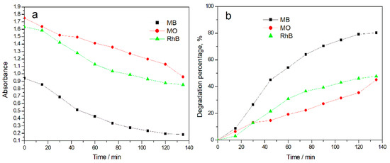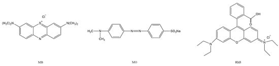 Xenon lamp was used as the experimental light source, CPTPPCu/PMMA electrospun fiber was selected as the photocatalyst, and MB, methyl orange (MO), and Rhodamine B (RhB) were studied as organic dyes for photocatalytic degradation. The degradation percentages were calculated, as shown in Figure 4. The experimental results showed that under the same conditions, the photocatalytic degradation efficiency of the electrospun fiber material CPTPPCu/PMMA for different organic dyes was MB > RhB > MO. At 135 min, the degradation percentages of MB, RhB, and MO were 80.35%, 47.70%, and 45.21%, respectively. Figure 5 shows the chemical structure formula of MB, MO, and RhB. Due to the chromogenic group aniline, =S+—in MB is easily damaged by external factors, and MB may demethylated under light irradiation and continue to decompose into smaller organic molecules. During photodegradation, the structure of RhB is destroyed and some unstable colorless organic intermediates are generated, leading to the photodegradation process and discoloration of the solution. However, the acidic azo structure and neutral alkaline quinone structure in MO are relatively stable, which requires more energy to degrade and fade. When it is degraded under ultraviolet and visible light, MO will also undergo demethylation and azo reduction. However, it requires a large amount of energy, which is not easy to achieve. As long as there is a small amount of energy, the structure of MB may change and cause the solution to fade.