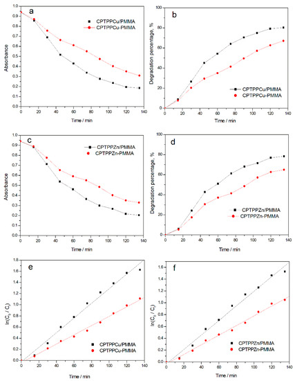 As shown in Figure 6, when the degradation time reached 135 min, the degradation percentage of CPTPPZn/PMMA electrospun fibers reached 78.31%, while CPTPPZn-PMMA electrospun fiber material was only 64.97%. The degradation percentage of CPTPPCu/PMMA electrospun fibers reached 80.35%, while CPTPPCu-PMMA electrospun fiber material was only 67.09%. The catalytic degradation process of all photocatalysts conforms to the standard first-order kinetic equation. The catalytic degradation effect of metalloporphyrin/PMMA copolymer electrospun fibers was significantly better than that of the metalloporphyrin-blended PMMA electrospun fibers. When the electrospun fiber is prepared by blending metalloporphyrin and PMMA, the metalloporphyrin monomer is often poorly dispersed in the polymer matrix. Due to the large conjugated structure of porphyrin, the intermolecular π–π conjugation is strong. Porphyrin monomer is easy to aggregate, and the active site of metalloporphyrin is easily encapsulated by PMMA, so it cannot effectively play a catalytic role. The covalent bond is used to connect the porphyrin monomer to the polymer skeleton to obtain the metalloporphyrin/PMMA copolymer. The metalloporphyrin monomer could be dispersed on the PMMA chain uniformly, which can effectively avoid the aggregation of porphyrins, retain more active sites, and improve the photocatalytic degradation ability of metalloporphyrins [20].