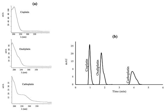 (a) Absorption spectra of cisplatin, oxaliplatin, and carboplatin; (b) Diode-array UV absorption chromatogram of a standard mixture containing 1 μg mL−1 of each platinized drug.