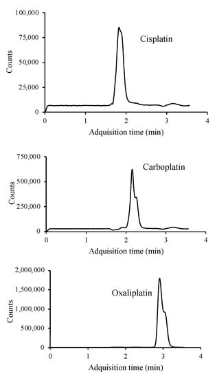 The LC-MS/MS method was applied to real urine samples belonging to patients under treatment with platinized drugs. Results can be seen in Table 4. Cisplatin, carboplatin, and oxaliplatin were detected in the samples in concentrations ranging from 0.331 to 58.7 µg mL−1.