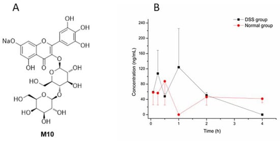 The structure of M10 and the concentration–time curve of M10. (A) The structure of M10. (B) The concentration–time curve of M10 in DSS-group mice and normal-group mice after oral administration of M10 (50 mg/kg) in plasma. Data are expressed as mean ± SD (n = 3). Plasma samples were collected at 5 min, 15 min, 30 min, 1 h, 2 h, 4 h, 6 h and 8 h after the dose.