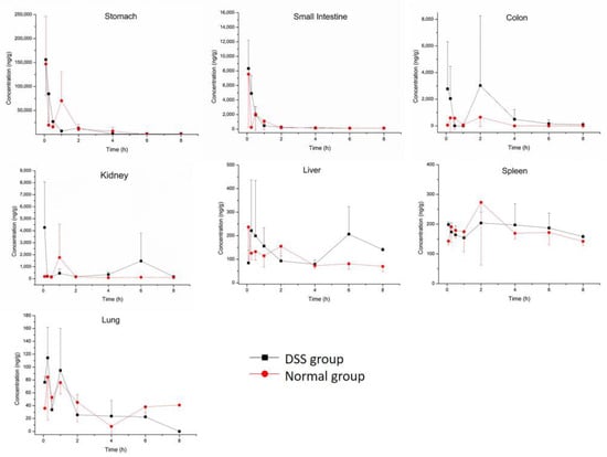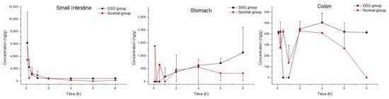 Tissue–plasma partition coefficients (Kp) were calculated using AUC0-t tissue/AUC0-t plasma [23,24]. The Kp value of the colon in the DSS group was about seven times larger than that in the normal group (Table 5). However, the Kp values in the stomach were found to be 693.39 ± 343.94 and 665.54 ± 210.34 in the DSS group and the normal group, respectively. The high Kp values in the stomach indicated that M10 exhibited centralized distribution in the stomach, which suggests that M10 might have pharmacological potential for treatment of gastric inflammation in the future.