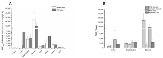 Tissue-distribution studies showed that M10 was widely distributed in the tested tissues, except for the heart. Compared with normal-group mice, the AUC (Figure 4A) and Cmax of M10 in the colon significantly increased in colitis mice, which would be beneficial to treatment of colitis. The AUC and Cmax of M10 in the small intestine were also observed to increase in DSS-group mice as compared with normal-group mice. These results revealed that absorption of M10 in the intestinal region ascended in colitis status due to increased colonic permeability. Systemic exposure and Cmax of M10 in main metabolic and excretory organs, such as the liver and kidney, were also enhanced in colitis status. Meanwhile, Tmax and T1/2 of M10 in tissues in DSS-group mice were more delayed than those in normal mice, which indicated that metabolic rate and elimination rate of M10 in colitis status were decreased. These results were not consistent with those recorded for plasma. The main reason for this is that related pathologic changes in colitis status altered absorption and distribution of drugs in the body. Metabolic enzymes in inflammatory-bowel-disease patients were reported as changed [17] both in the liver and the intestines [18]: for example, P450 enzymes [19,20], transporters [21] and conjugative enzymes [22]. Variation of metabolic enzymes or transporters might be one of the main reasons for change of elimination rate of M10 in colitis status.