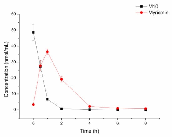 As shown in Figure 5, about 50% of M10 was metabolized by fecal flora at 0.5 h. Almost 90% of M10 was metabolized at 1 h. M10 was metabolized completely at 8 h. Meanwhile, myricetin was generated and achieved at maximal concentration at 0.5 h. The maximal concentration of myricetin was 36 nmol/mL, which is equal to 80% of the initial equivalent of M10. This revealed that M10 was metabolized by the fecal flora of the mice and most of the M10 was metabolized to myricetin in fecal flora.