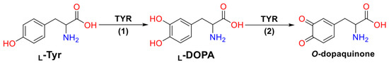 The biosynthetic path of melanin involves several steps including the hydroxylation of L-Tyrosine (L-Tyr) to L-3,4-dihydroxyphenylalanine (L-DOPA), a monophenolase stage (1), followed by the subsequent oxidation of L-DOPA to O-dopaquinone, a diphenolase stage (2) [7] (Figure 1). Both reactions are catalyzed by a type-3 copper metalloenzyme called Tyrosinase (TYR), which contains a binuclear copper active site in which each Cu2+ ion chelates with three histidine (His) amino acid residues [8].