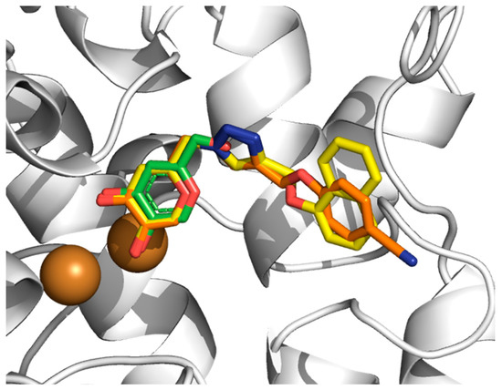 Three-dimensional overlapping of KA (green), 6h (orange) and 6o (yellow) into TYRBm catalytic site by molecular docking. Cu2+ ions are shown as brown spheres. H atoms are omitted for clarity. All PDB files are provided as Supplementary Materials.
