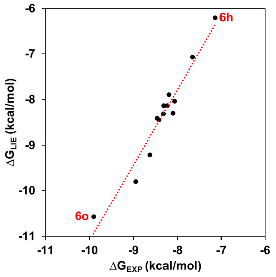 In Table 3, it can be observed all ligand-surrounding energies for KA analogs computed from MD simulations. Here, a total of 10 ns of MD simulations for each TYR system was chosen to compute LIE free energy (ΔGLIE) values. The empirical parameters α and β were chosen directly from the literature [38], see Table S1 for details. Particularly, the optimized value of (equal to 17.33) of LIE equation (Equation (1)) was calculated from the linear fitting with ∆GEXP in order to include the Jahn–Teller effect included in the CuDum model for the bound models [34]. Particularly, it was found that excluding 6d, 6g and 6k inhibitors resulted in a significantly better correlation with the ∆GEXP, so in all LIE discussions presented below, these KA analogs were excluded from the analysis, and a similar strategy was used by Carlsson et al. [27] and Vanga et al. [39].