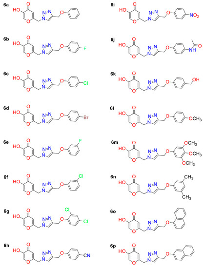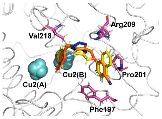 In particular, the hydroxyl groups of the KA part of 1,2,3-triazole-based KA inhibitors (6a–6p) interact with Cu2+(B) (Figure 2), producing distances of about 3.30 Å. Furthermore, the KA ring of 1,2,3-triazole compounds is involved in a hydrophobic pocket created by Met215, Gly216, Val217, Val218 and Ala224, as found in the KA inhibitor. Among the most important interactions, we can highlight the interaction with a key residue Arg209 through the π–cation stacking interaction with 1,2,3-triazole ring present in all KA analogs, for the natural substrates, this residue is responsible to form hydrogen bonds with the carboxylic group of substrates (L-Tyr and L-DOPA) [24,25].