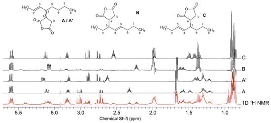The compounds that could be formed through “ene” and “allylic” mechanisms from the reaction of trans-3-octene and MA are shown in Scheme 4. Four derivatives were expected, each of them in four stero-isomeric forms, but the only derivatives detected were compound A and its diastereomer at C-4, A’, and one stereoisomer each for compounds B and C, while compound D was not detected. The accurate chemical shift values of each compound were obtained using CSSF-TOCSY, as demonstrated in Figure 1, and their assignments are reported in Table 1.