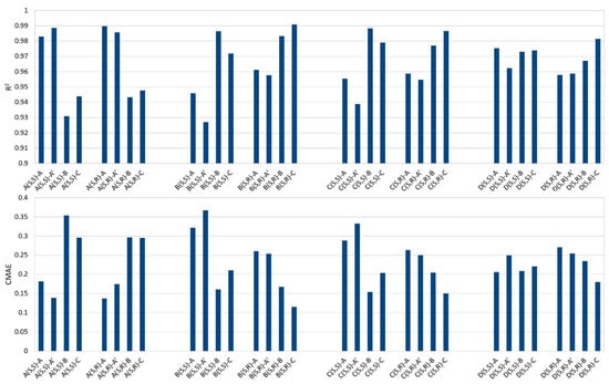 In contrast, the comparison of calculated and experimental proton resonances was more insightful. In Figure 2, we show the correlation coefficients R2 for each correlation: the first two sets of experimental values, assigned to the pairs of diastereoisomers A and A’, show a very high correlation with the calculated values from the two diastereoisomers of A. Specifically, both the correlation of the calculated values for the (S,S) isomer with the experimental values labeled A in Table 1—and of the calculated values for the (S,R) isomer with the experimental set A’—have R2 > 0.99. More importantly, the other two sets of experimental data, B and C, are clearly in disagreement, with R2 < 0.95. However, the level of confidence of these computational protocols does not allow us to state with confidence that the experimental set A and A’ corresponds to (S,S) and (S,R), respectively, since the correlation of (S,S) with A’ and (S,R) with A is also high. Similarly, the CMAE values agree with the above conclusions.