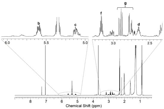 The product of methyl oleate with MA contains the moiety shown in Figure 3, and the NMR spectrum (Figure 4) showed the following characteristic peaks (δ 1H ppm, δ 13C ppm): a (2.0, 32.9), b (5.61, 136.87), c (5.13, 126.66), d (2.65, 45.65), e (1.40, 33.03), f (3.16, 42.76), g (2.77–2.90, 30.34).