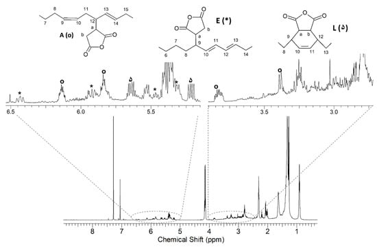 1H NMR spectrum of the reaction product of ethyl linoleate with MA; the signals are highlighted by different symbols: ۵ compound A; * compound E (or F); ο compound L (or M) of Scheme 3.