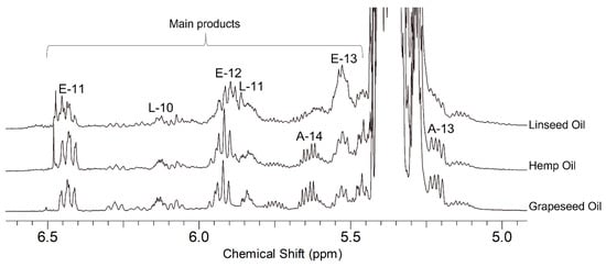 The composition in terms of the saturated and unsaturated fatty acids of the grapeseed, hemp, and linseed oils was determined by NMR, as shown in the supplementary material (Figures S4–S7, Tables S2 and S3).