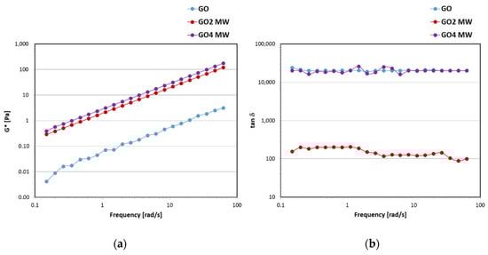 Trend of the complex G* modulus (a) and damping factor tanδ (b) in function of the oscillation frequency for GO, GO2 MW, and GO4 MW.