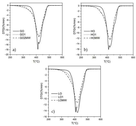 DTG curves for (a) GO, (b) HO, and (c) LO and the corresponding maleated derivatives.