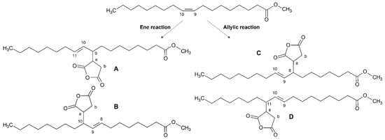 - A free radical mechanism that involves the attack of MA on the allylic carbons and the maintenance of the double bond in the same C9-C10 position, which can be hydrogenated as well, and bearing the ASA moiety on C8 or C11 [37] (Scheme 1, route allylic reaction), giving rise to the species C and D, respectively.