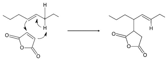 - The “ene-Alder” reaction which involves the attack of MA (acting as a highly reactive enophile, its double bond being an electron-deficient alkene) on the carbons bearing the double bond (the “ene” moiety) [35,36] thus shifting the double bond on the vicinal carbon and forming a new σ-bond between the two molecules through the general concerted mechanism reported in Scheme 2 [31];
