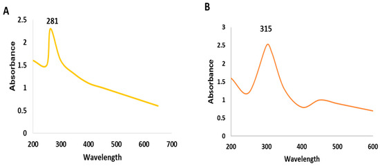 The green synthesized SeNPs and CeONPs were characterized by using UV-Visible spectroscopy, SEM, EDX and XRD.UV-Visible spectroscopy is widely used for reduction and capping of NPs. According to the UV-Visible spectroscopy conducted, the absorbing peak of SeNPs was noted at 281 nm (200–400 nm), while that of CeONPs was at 315 nm (200–400), as shown in Figure 1A,B, which confirmed the formation of SeNPs and CeONPs, respectively. The result of the present study was supported by the previous study of Fesharaki et al. [32], who prepared SeNPs from Klebsiella pneumonia that exhibited the highest absorbance at 280 nm. Kokila et al. [33] reported that NPs produced from Diospyros montana produced a peak around 261 nm. CeONPs synthesized from Olea europaea leaf extract by Maqbool et al. [34], had a maximum absorption peak similar to that observed in our study.