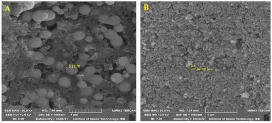SEM analysis was used to investigate the morphologies of SeNPs and CeONPs and revealed the spherical shape of SeNPs and CeONPs. The average size of SeNPs and CeONPs was approximately 61 nm and 42 nm, respectively (Figure 2A,B). Our study agreed with Verma and Maheshwari [35], who reported a 74.25 nm average size of SeNPs. The results were like those of [33,36,37,38,39], who reported spherical SeNP and CeONP production from plant extracts.