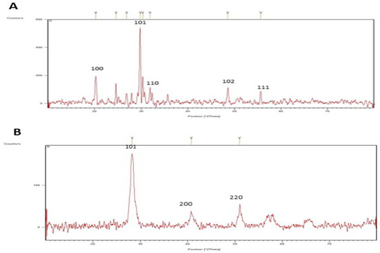 XRD spectrum of the green synthesized nanoparticles (NPs). (A) SeNPs, (B) CeONPs.
