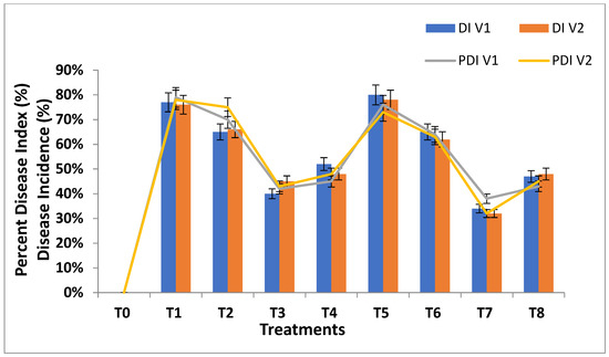 The disease severity in percentage is called the disease index and can be calculated by using the methodology of Iftikhar et al. [49], as shown in Equations (2) and (3):
